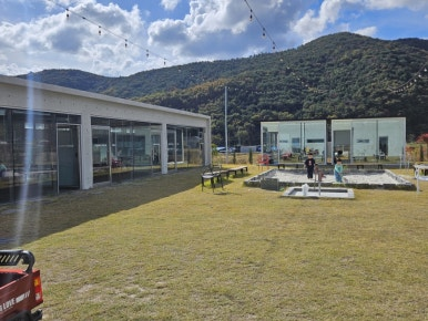 카페 맞은편에는 잔디를 중앙에 두고